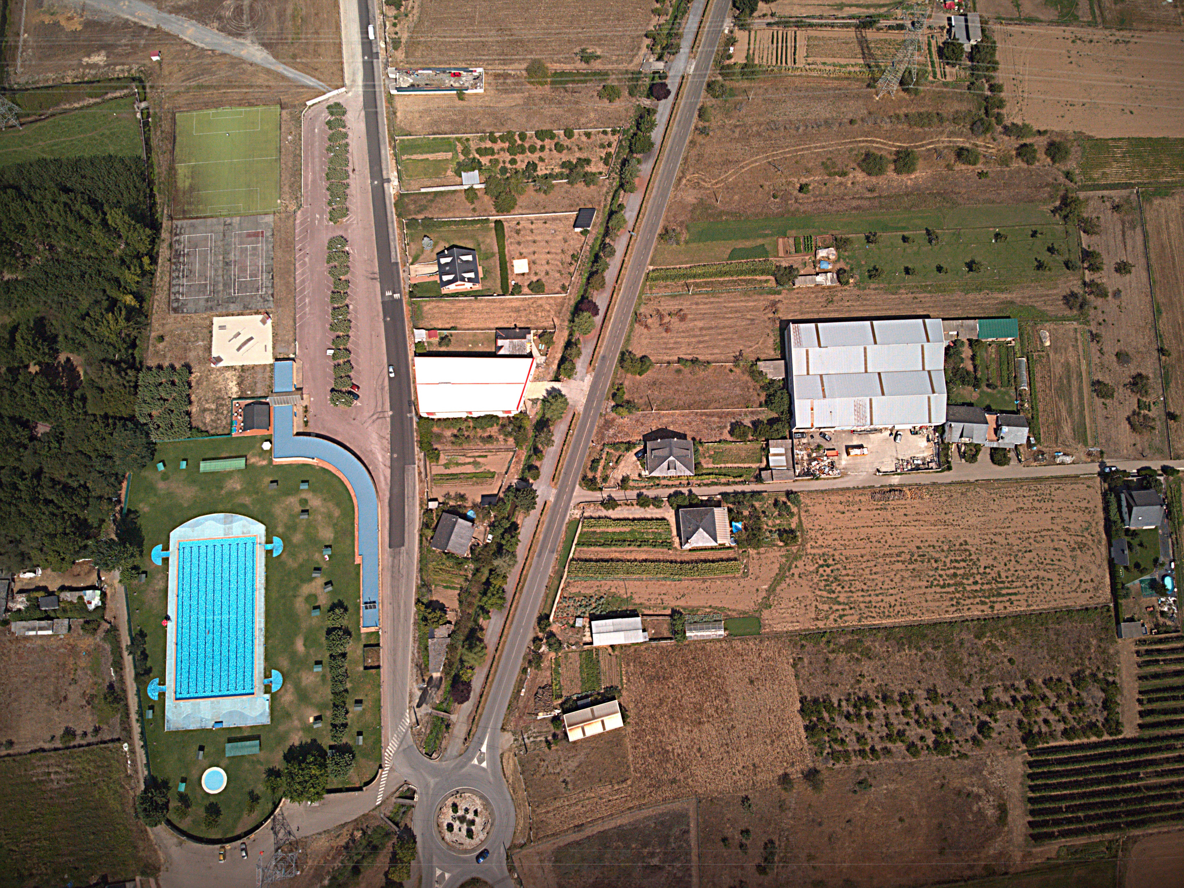 La Piscina Municipal, el área de actividades deportivas como las pistas de tenis y el Campo de Futbol. La rotonda donde prosigue la calle Edrada y donde comienza la carretera en dirección a Quilós (LE-4211).
