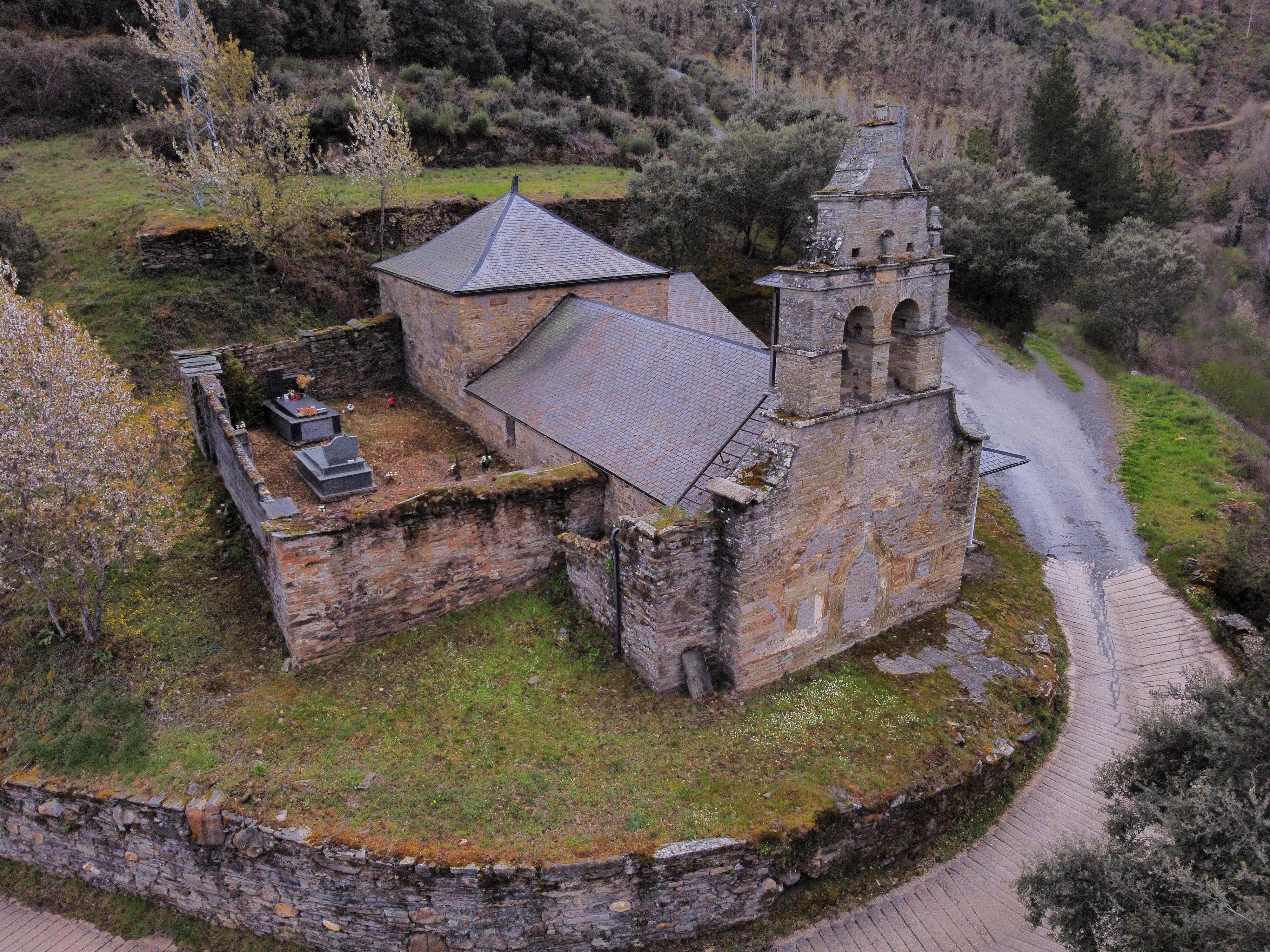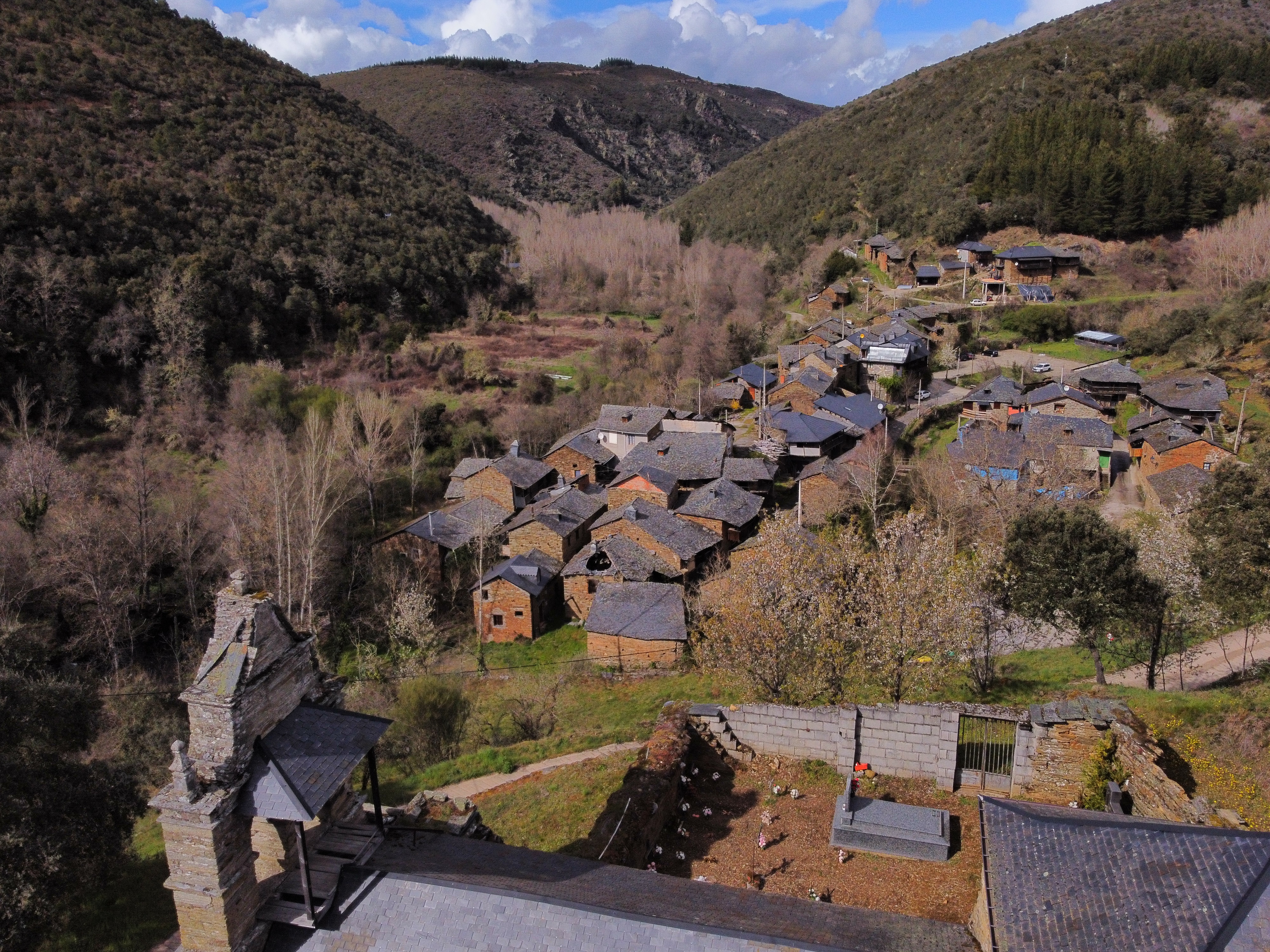 La localidad de San Vicente del municipio de Arganza (El Bierzo- León). En primer plano el campanario de la Iglesia de San Vicente y, a su lado, su pintoresco cementerio.