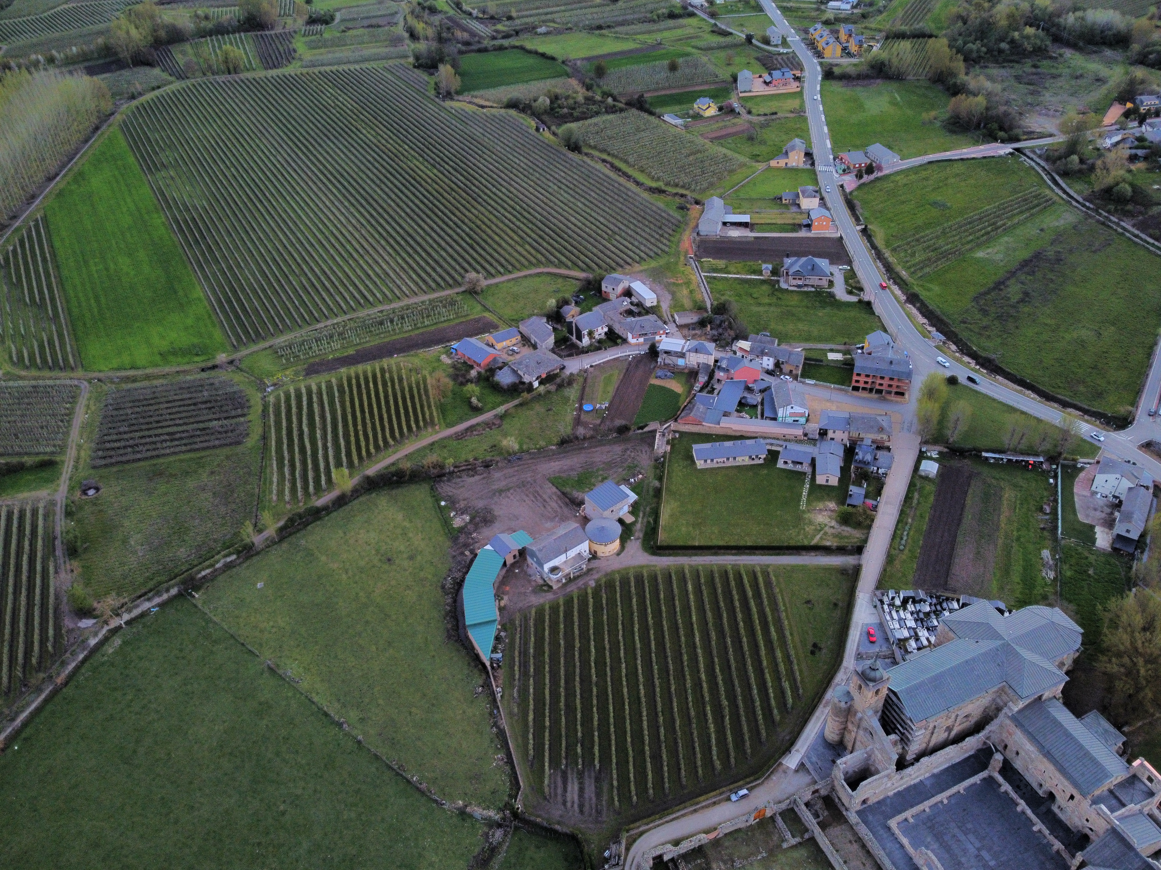 El área de Carracedo del Monasterio del otro lado de la vía que une Cacabelos con Carracedelo, con una vista de su Monasterio en primer plano.