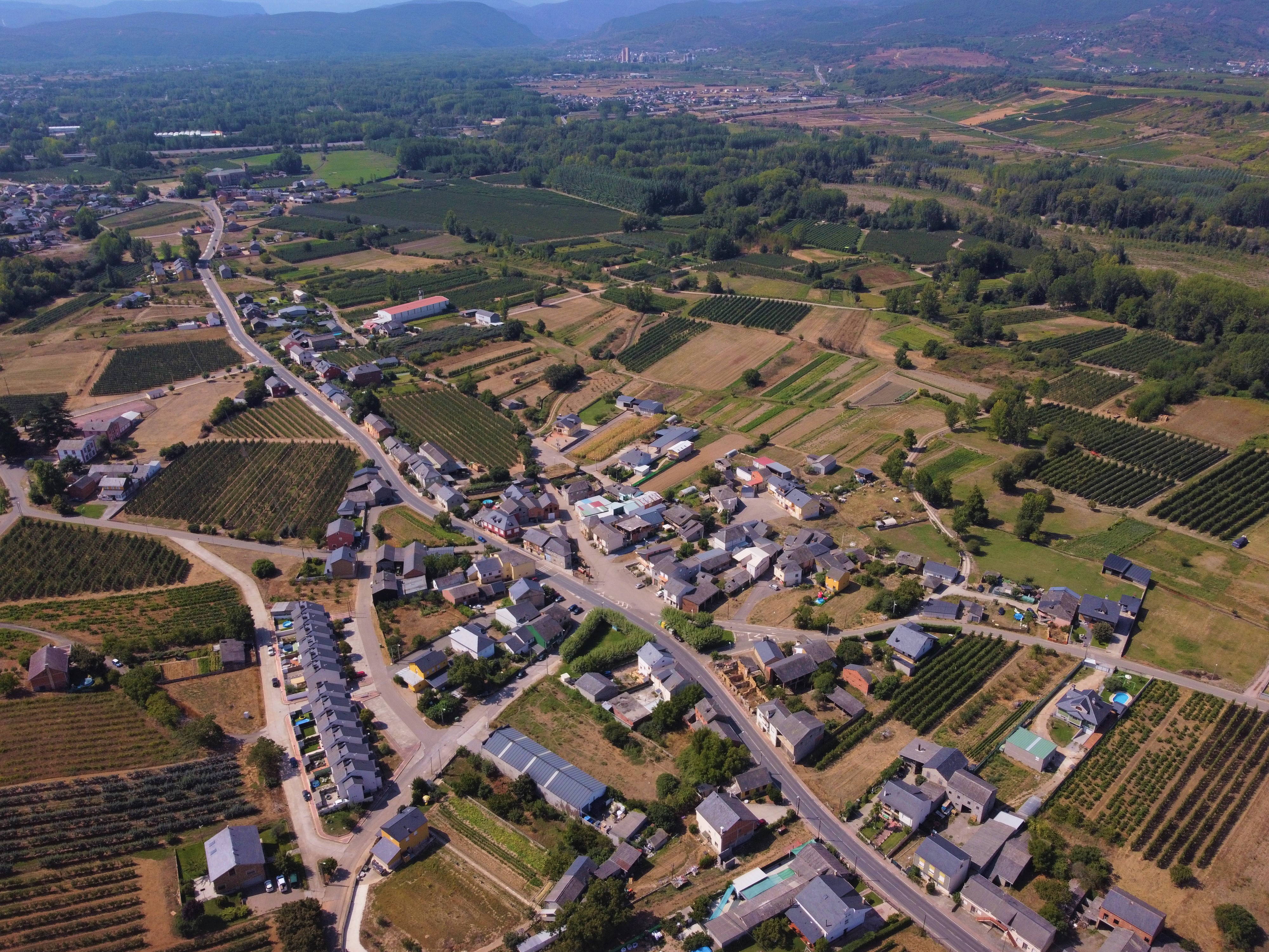 El barrio de San Juan de Carracedo en primer plano y al fondo la localidad de Monasterio de Carracedo, ambos pertenecientes al municipio de Carracedelo.