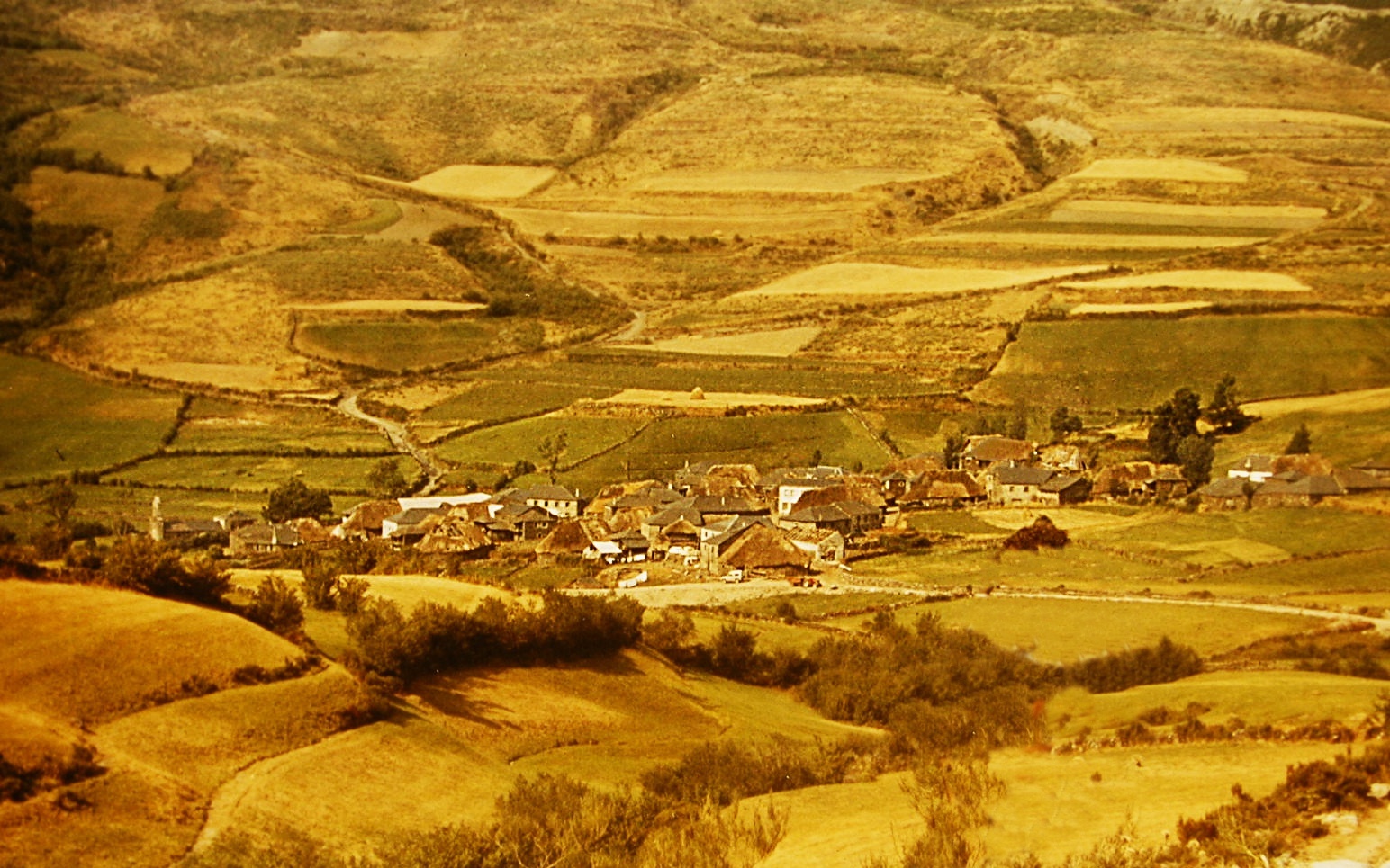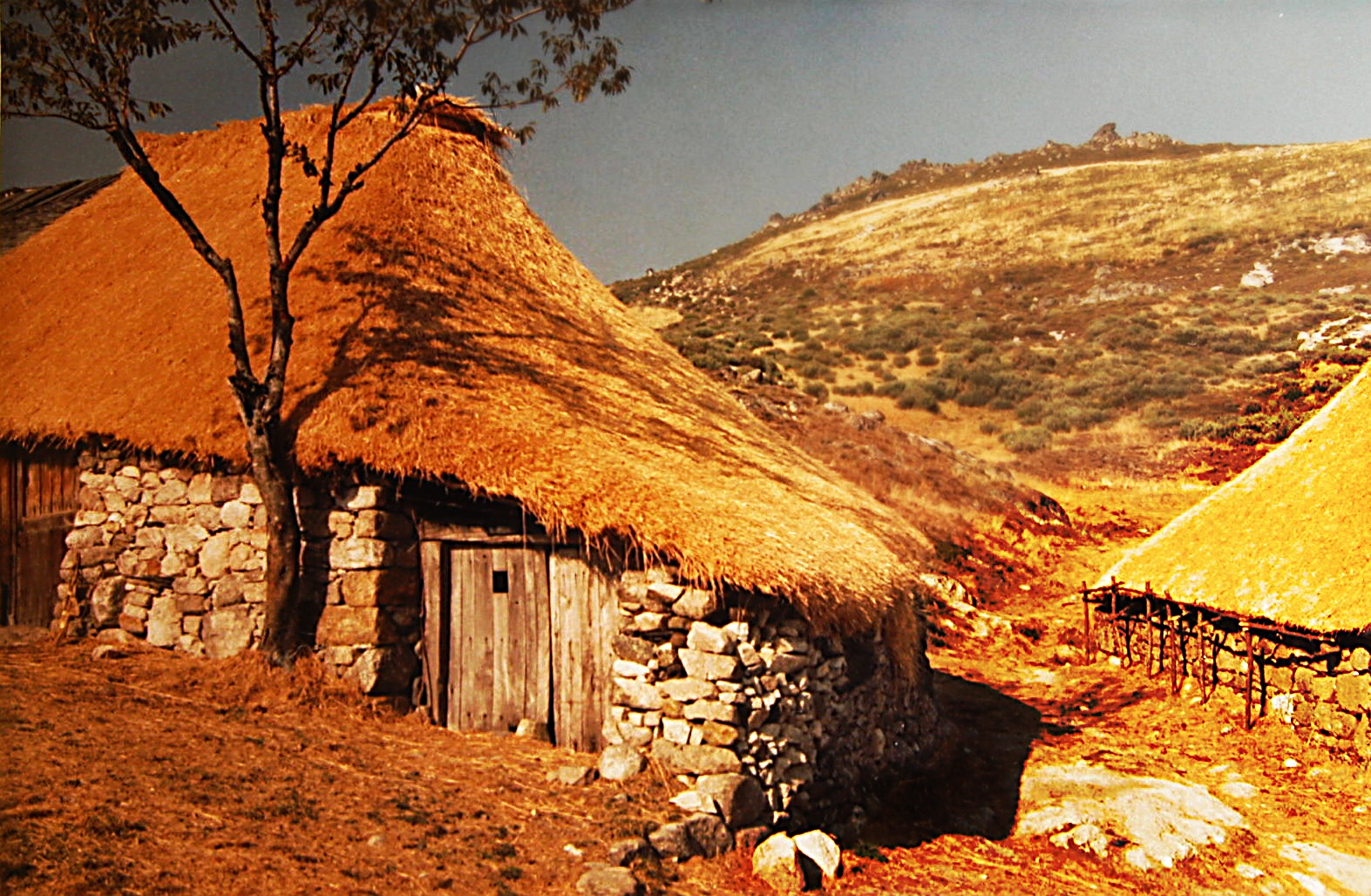 La aislada y sorprendente aldea de Campo del Agua con sus típicas y ancestrales pallozas se ubica en el término municipal de Villafranca del Bierzo (León). La fotografía es de 1987, cuando su acceso era harto complicado por sus deteriorados caminos y altitud (1.271 m). La toma se realizó dos años antes de la destrucción por el fuego (1989) de buena parte de su patrimonio. Durante muchos años los vecinos de Aira da Pedra bajaban su ganado antes de aparecer las primeras nieves del invierno y lo volvían a trasladar a esta elevada aldea con la llegada de la primavera.
