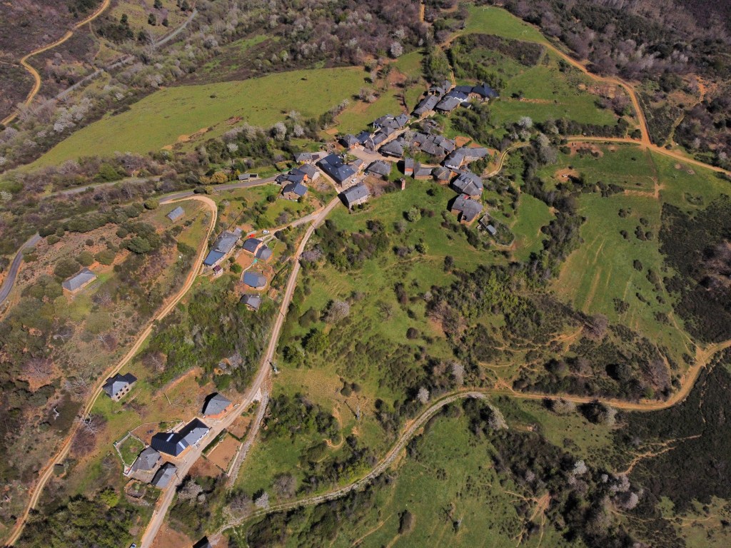 La Iglesia de Paradiña en el centro del pueblo y su singular y llamativo campo de futbol al fondo a la derecha; en él podemos imaginarnos a los voluntariosos jugadores, tras un impetuoso chut donde el balón rompe los límites del campo, tratando de localizarlo entre la espesura del monte.