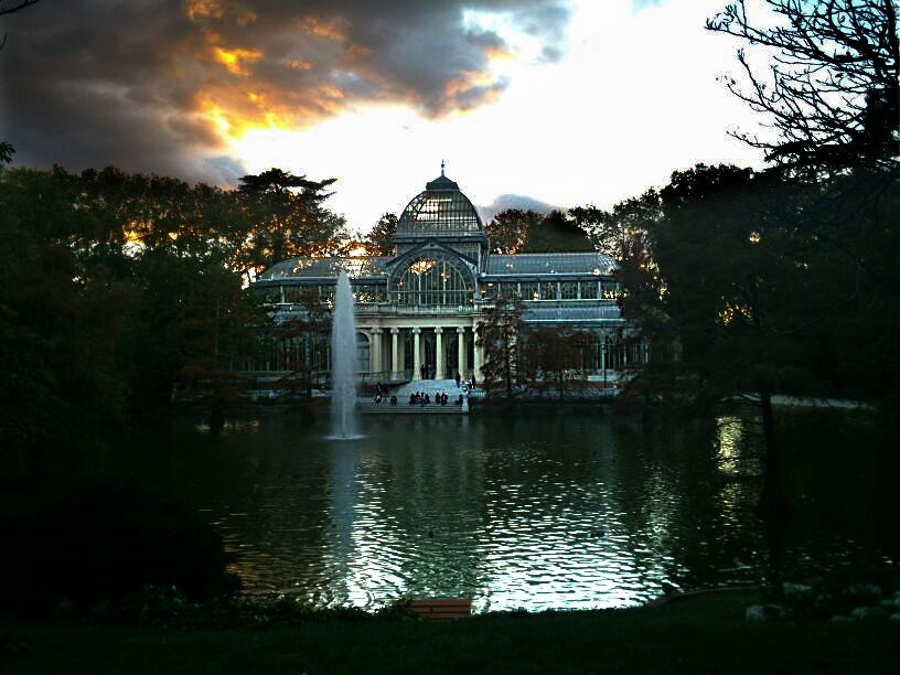 Atardecer sobre El Palacio de Cristal, en el Parque de El Retiro, todavía con el ambiente humano que le caracteriza.