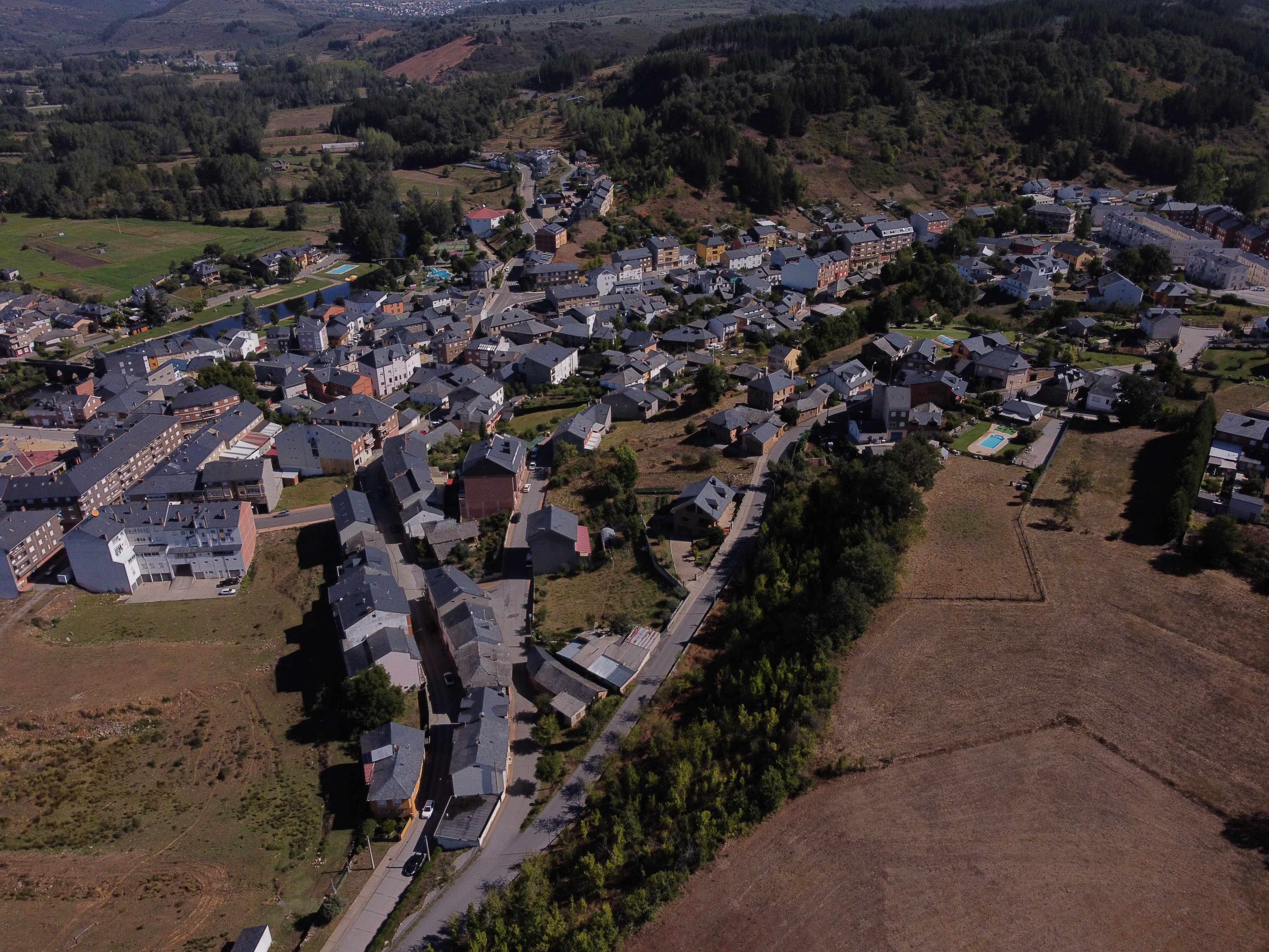 Otro importante emblema de Vega de Espinareda: su río Cúa vertebrando esta bella localidad con su puente romano junto al que forma parte de la Avda. Ancares y que conduce a Sésamo, al fondo de la imagen.