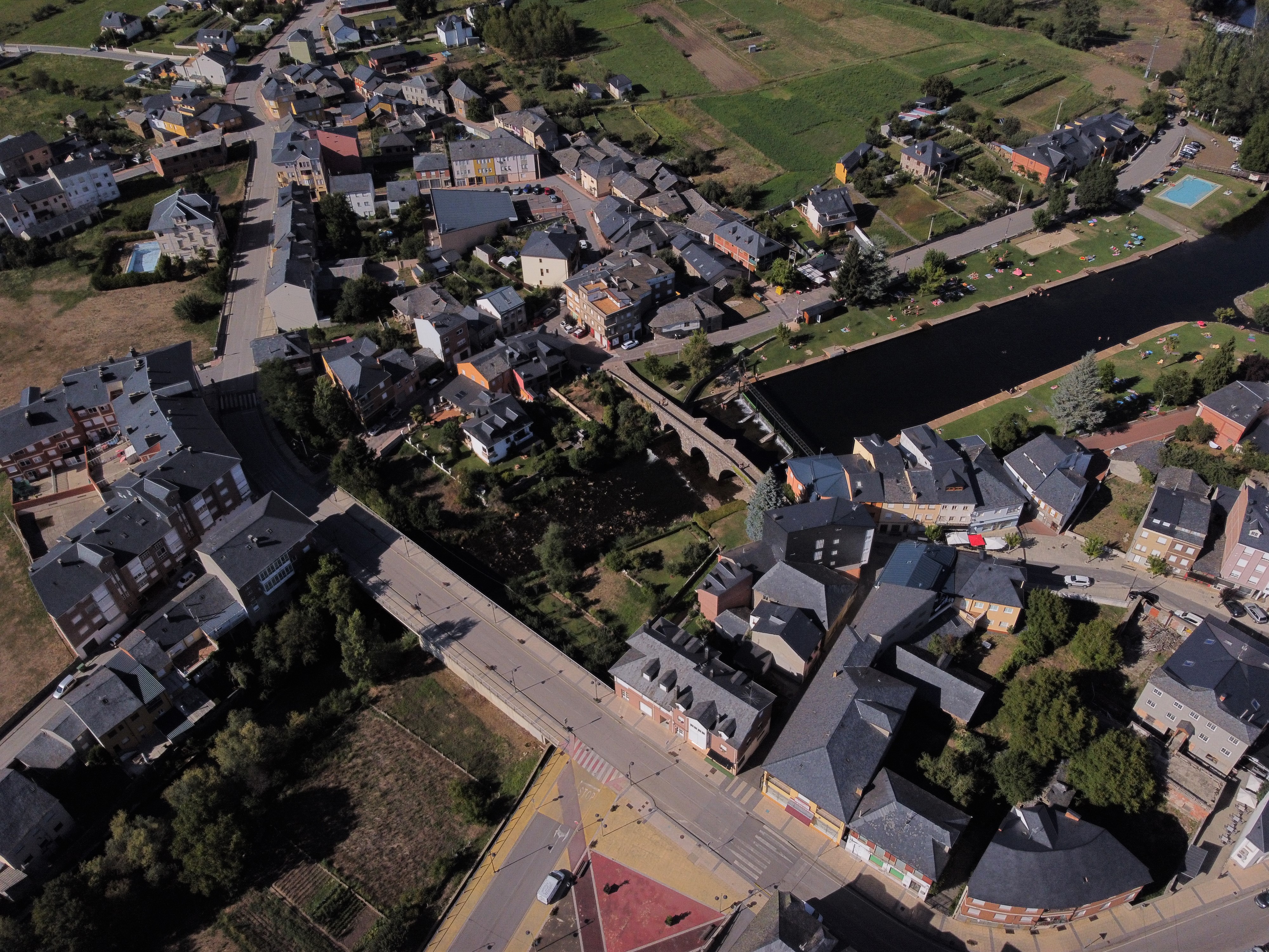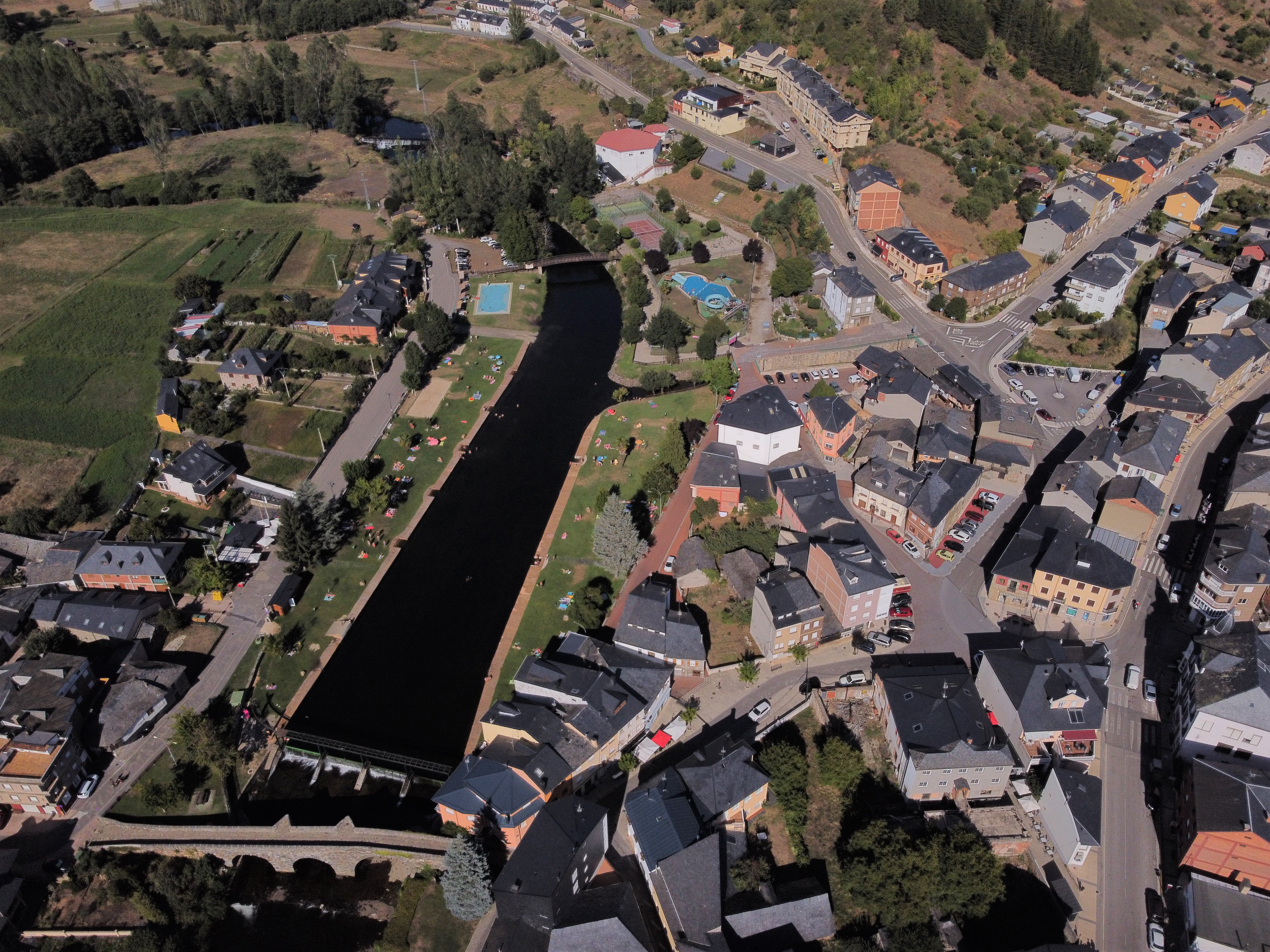 Puente Romano y la zona de baños. En primer plano la Avda. Ancares.