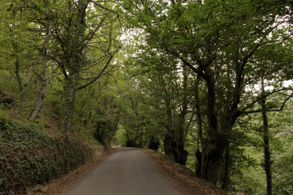 Imagen de la carretera cercana a Castropetre invadida por monumentales castaños.