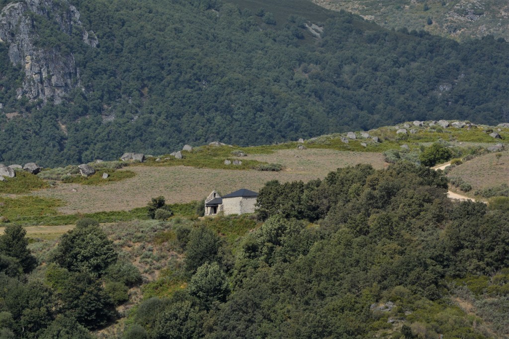 La primera edificación en las estribaciones de la Sierra de Ancares es La Ermita de San Bartolomé, en el centro de la imagen.