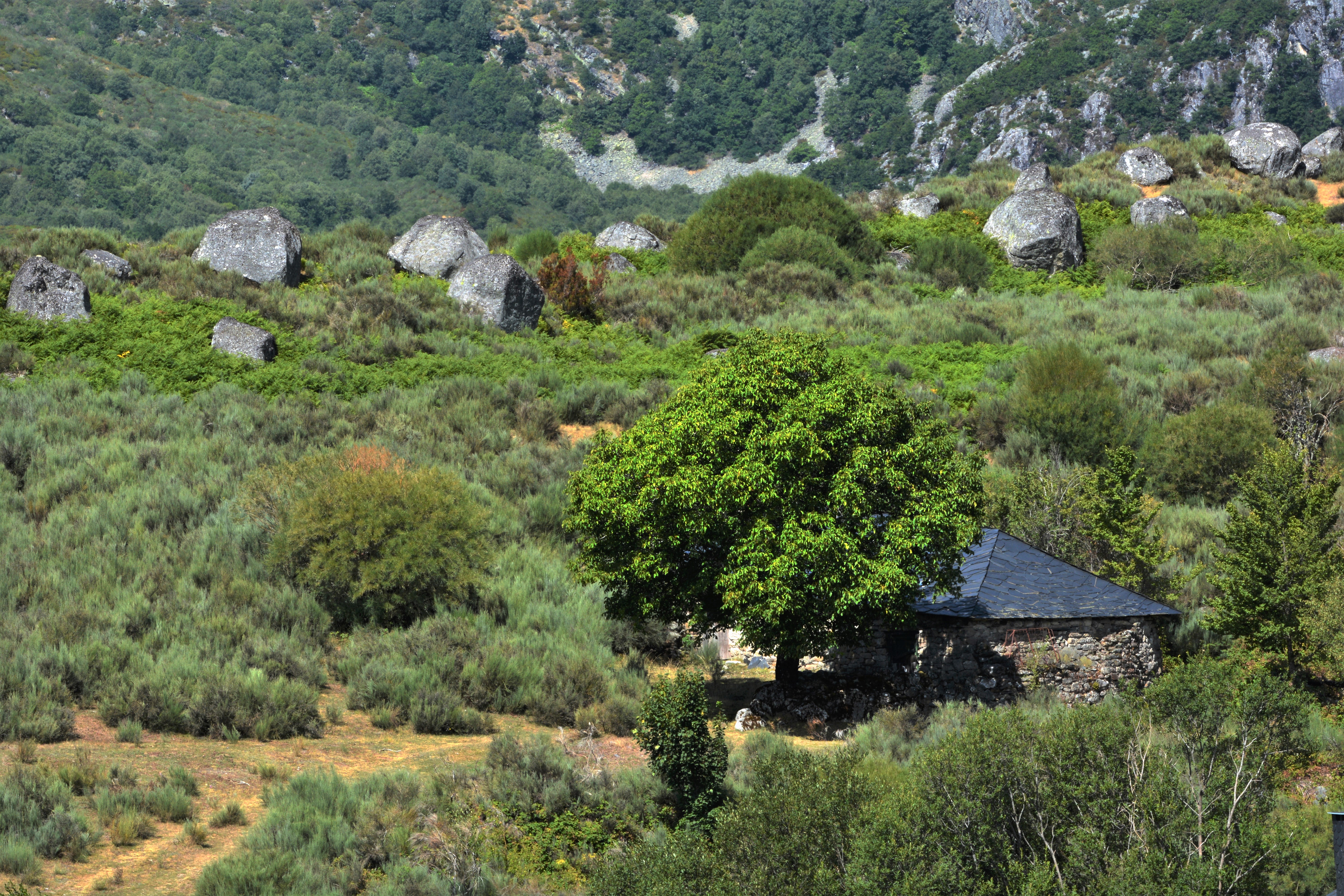 Ejemplar de castaño en las cercanías de Campo del Agua, junto a lo que tiempo atrás fue una antigua palloza; en la actualidad transformada con el techo de pizarra.