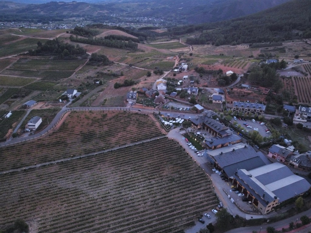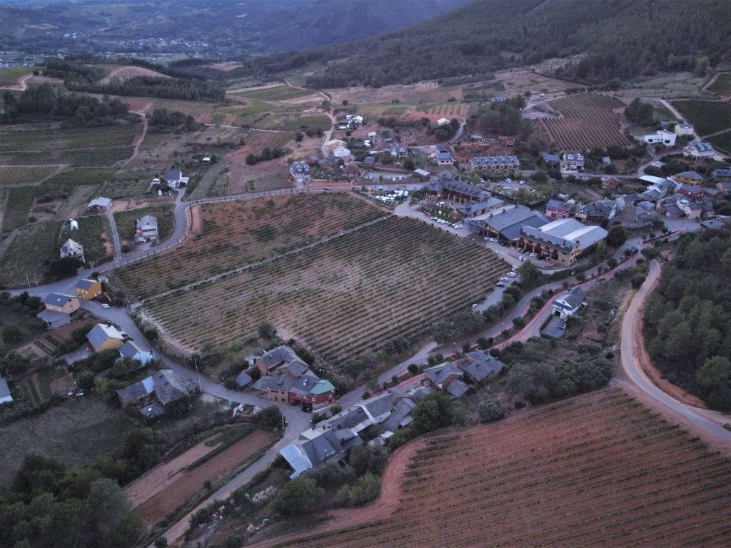 La localidad de Canedo (Arganza) significativamente transformada desde que nuestro admirado paisano cacabelense José Luis PRADA puso en acción su actual y popular Palacio, en el centro de la imagen. Al fondo puede observarse Villabuena (Cacabelos).