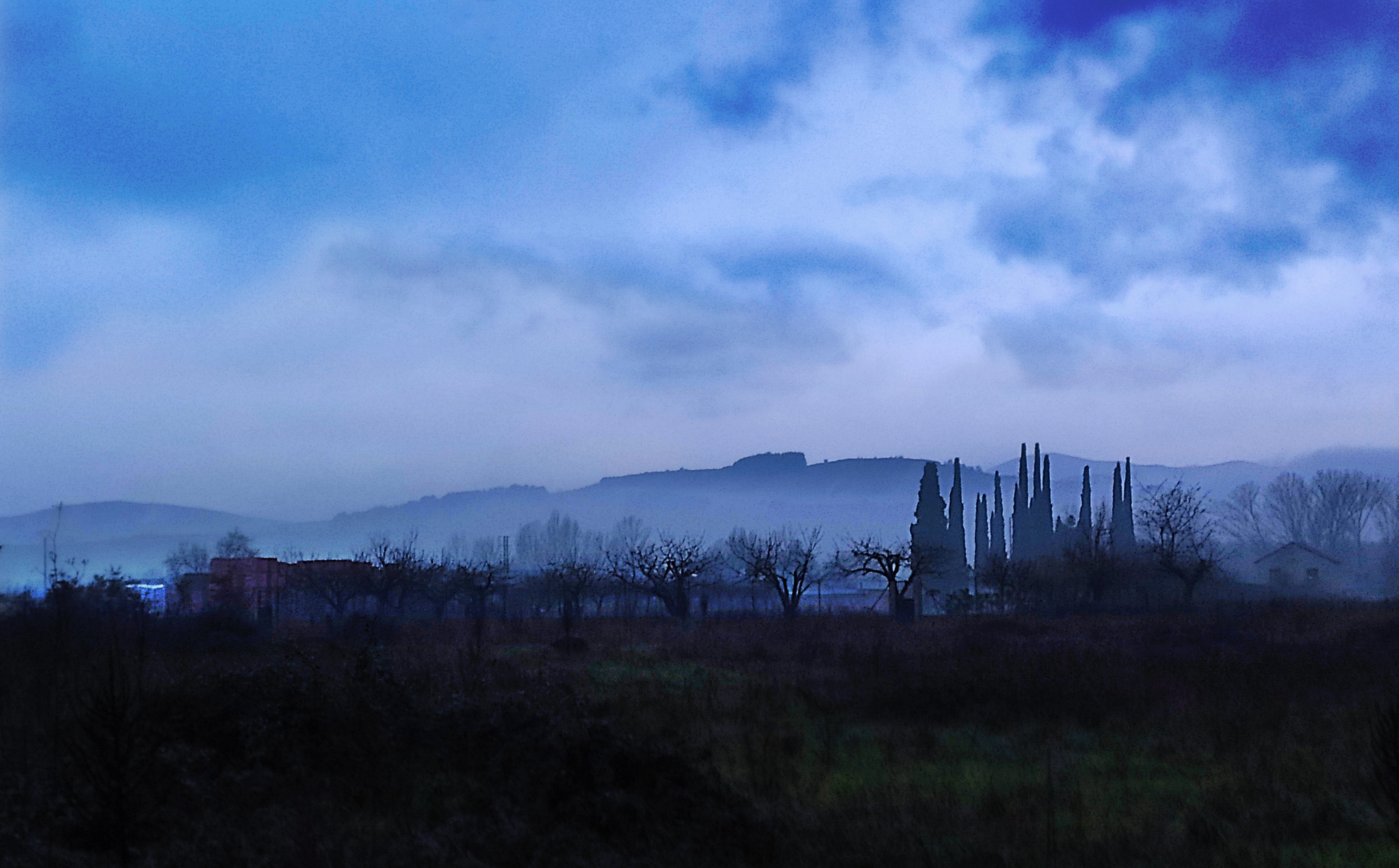 El Cementerio en medio de la niebla con Castro Ventosa al fondo.