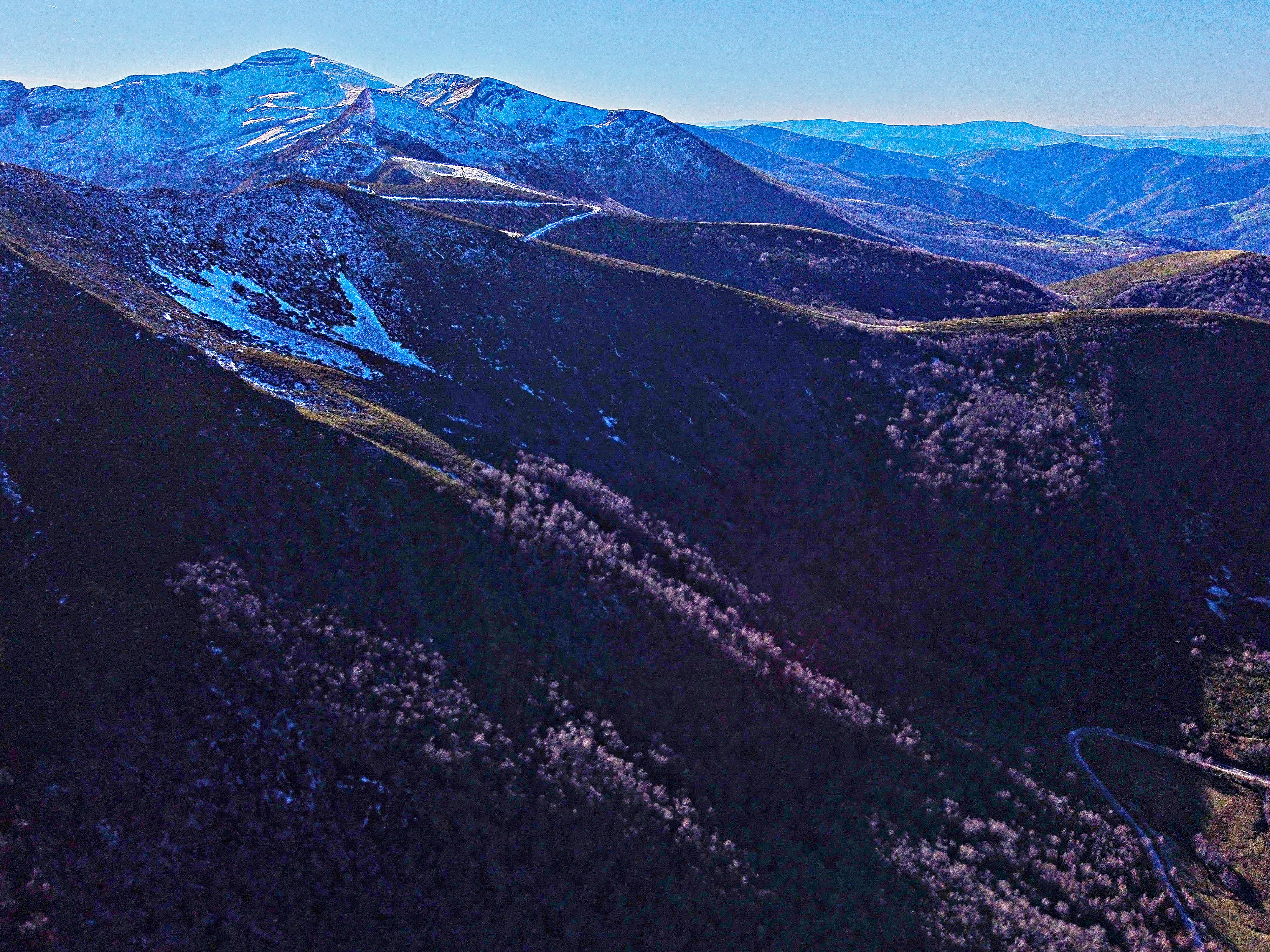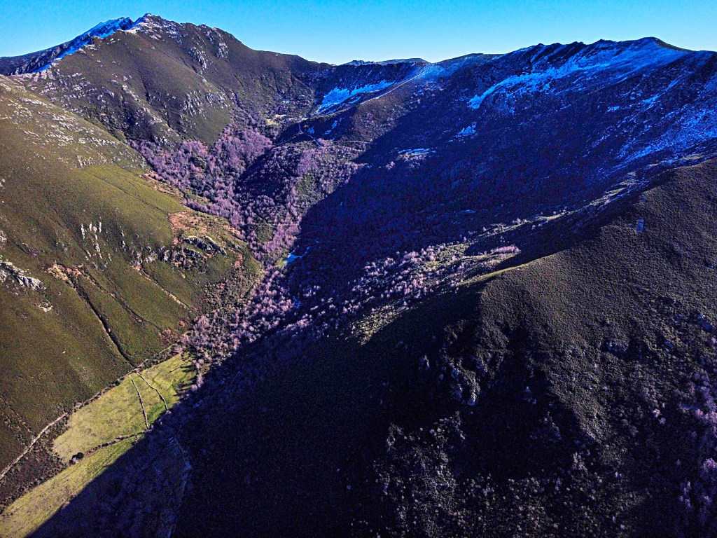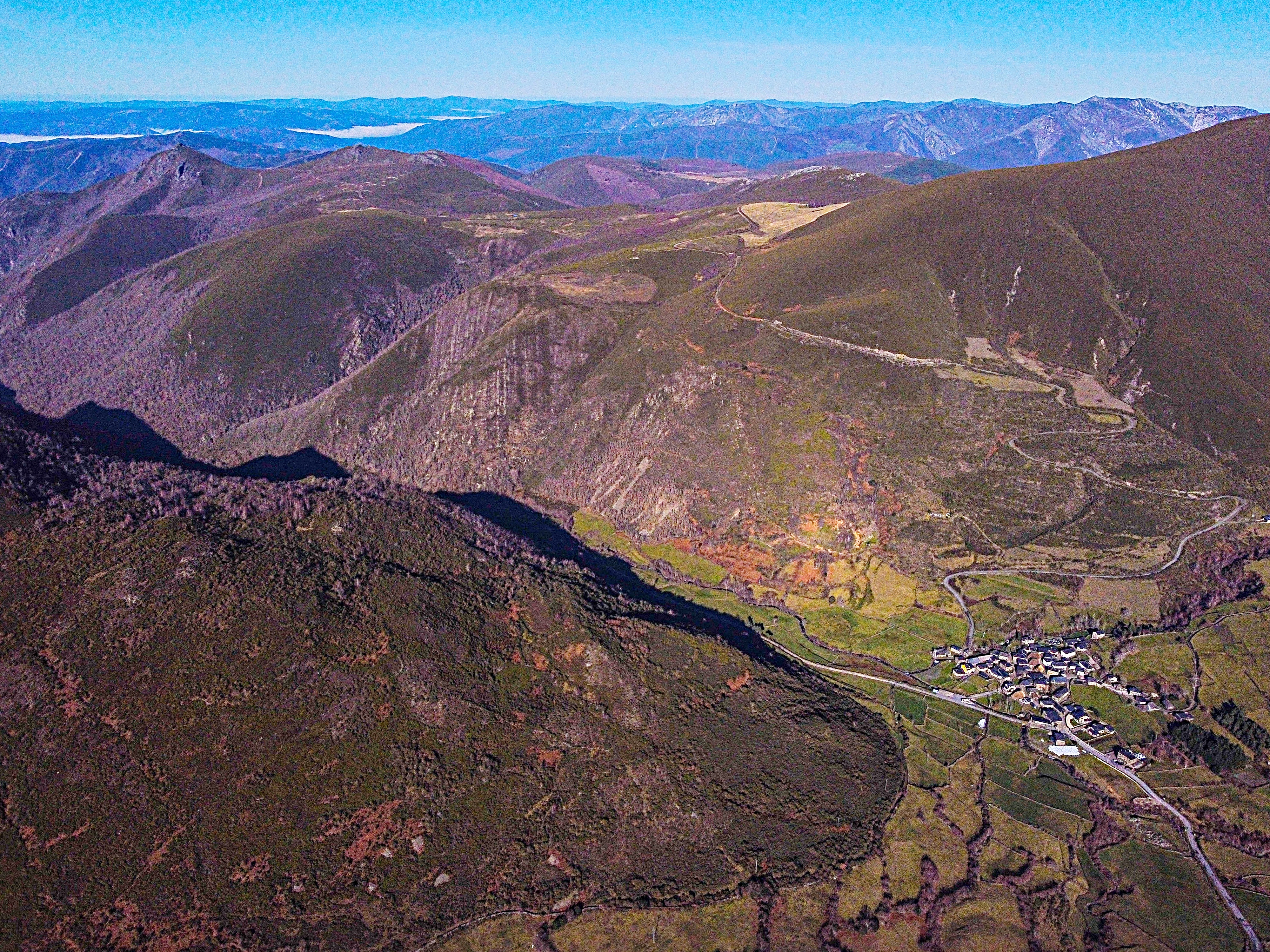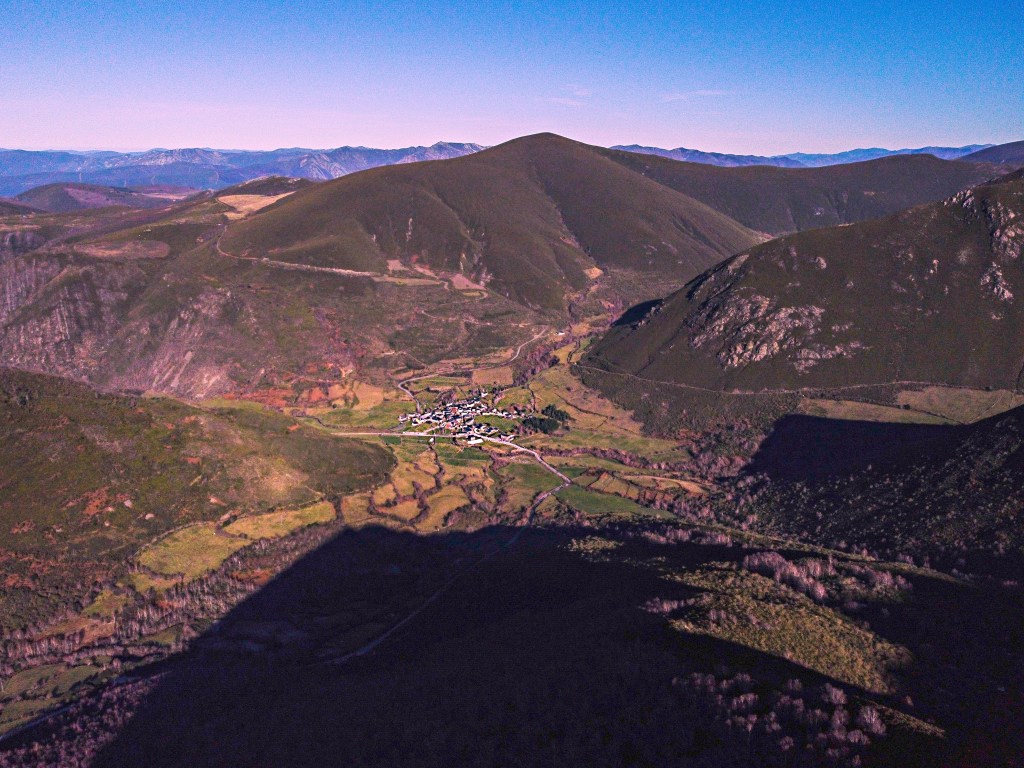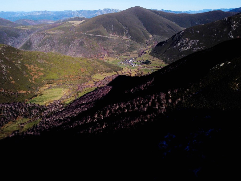 La vertiente del imponente Miravalles (1969 m), al fondo a la izquierda, comienza a vestirse de blanco con las primeras nieves invernales. Este pico se considera uno de los más atractivos balcones de Los Ancares en el que, al pie de sus faldas, se ubica estratégicamente el fascinante poblado que nos ocupa.