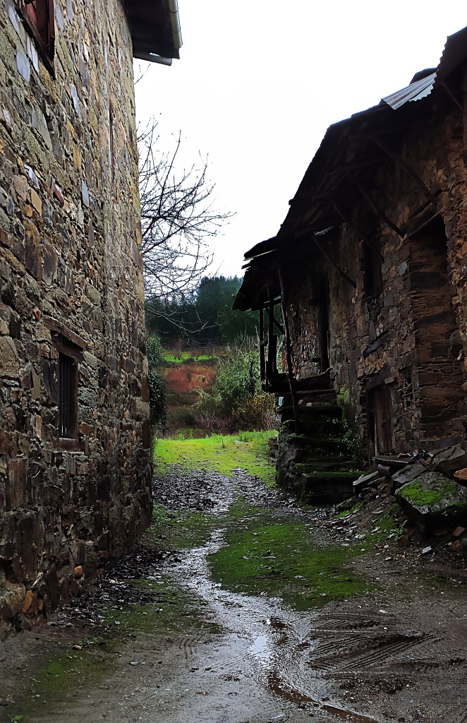 Típico callejón de Arganza con sus típicas construcciones bercianas.