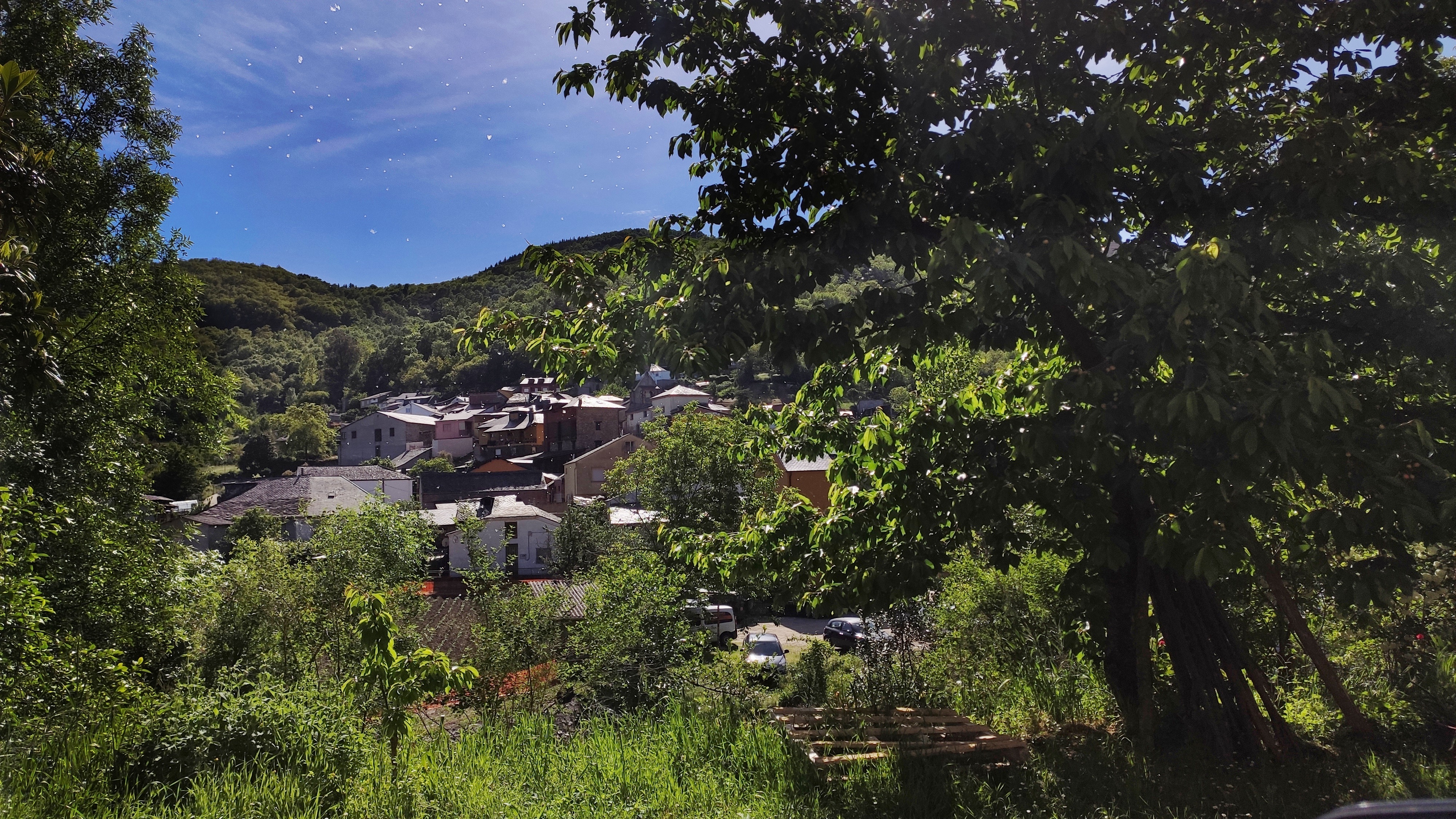 Castro Ventosa al fondo y, en primer plano los cerezos con sus frutos llegando a la maduración.