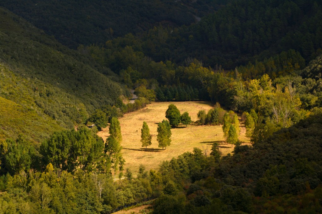 Prados sedientos cercanos a San Pedro de Olleros y al río Ancares, regocijándose por la suave caricia de la luz de una fugaz tormenta.