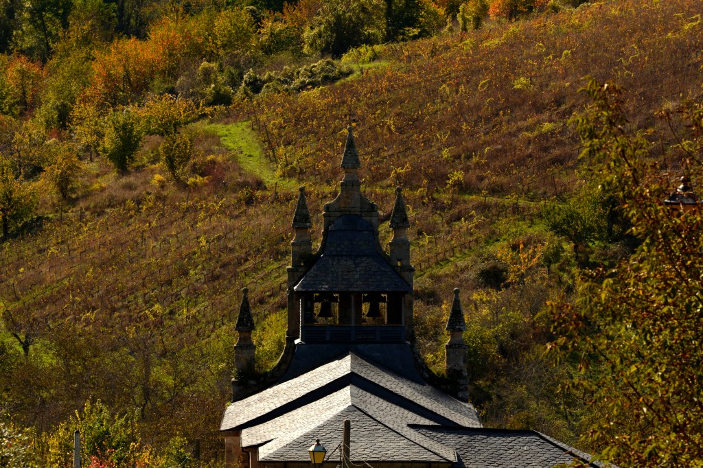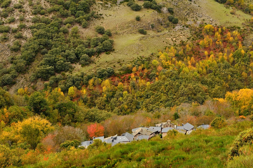La bella aldea de Peñalba de Santiago rodeada de empinadas montañas vestidas de otoño.