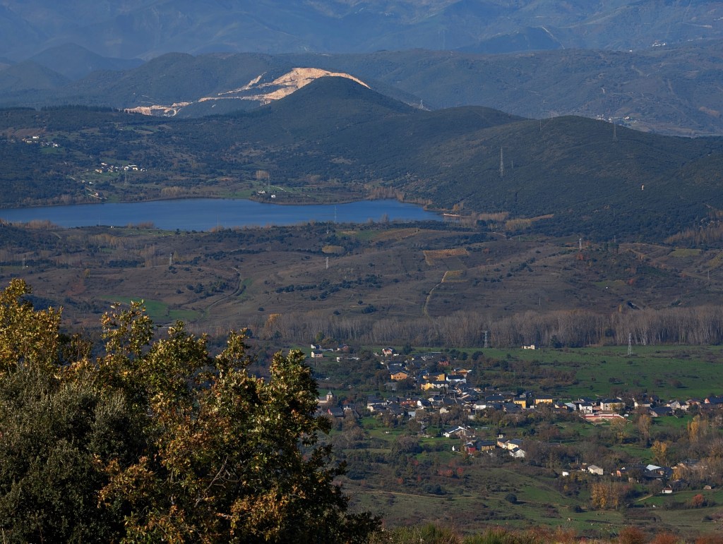 El pueblo de Carucedo con su cercano lago artificial fruto de siglos de lavado de las tierras de Las Médulas donde el imperio romano se propuso extraer de ellas la máxima cantidad del preciado metal dorado.