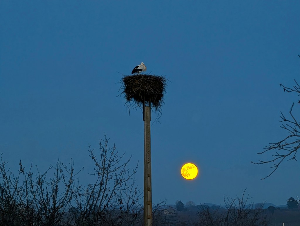 Una extraña luna amarillenta es contemplada por una confiada cigüeña antes de sumergirse en el profundo sueño diario tras otra jornada de supervivencia en un indeterminado punto entre Quilós y Cacabelos.