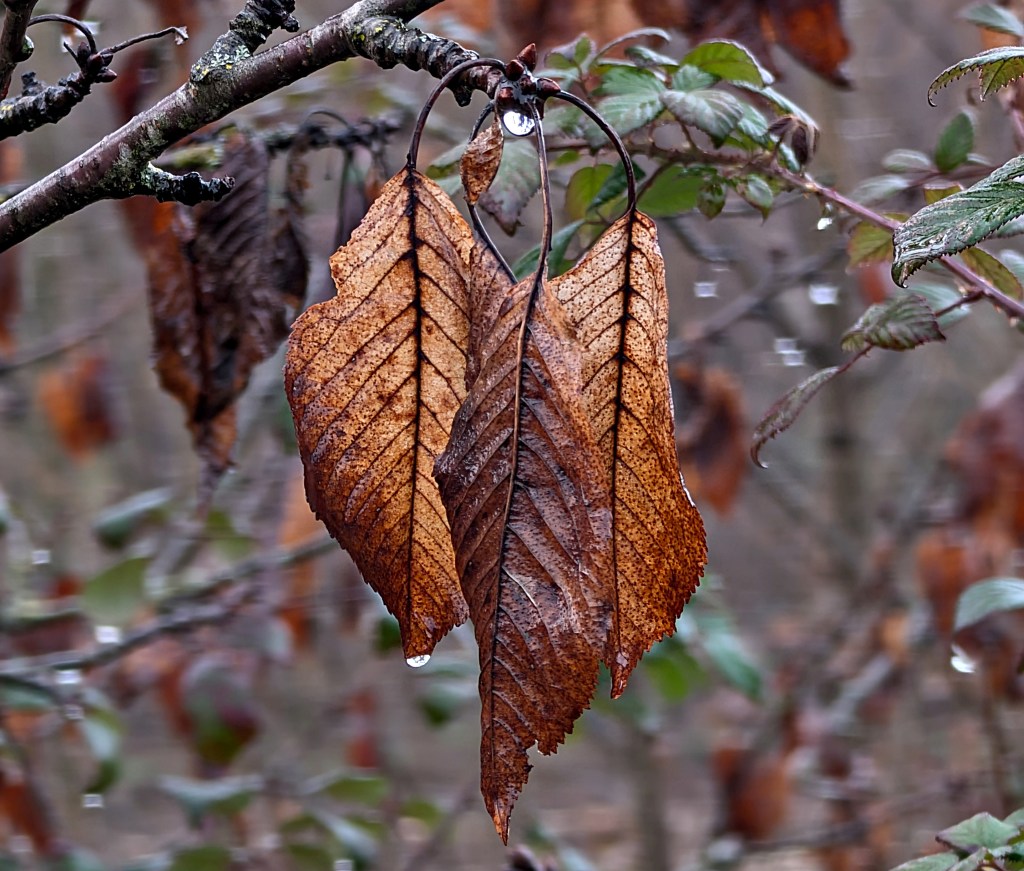 Senescentes hojas de cerezo se resisten a su caída bajo la lluvia en las inmediaciones de Cacabelos, El Bierzo.