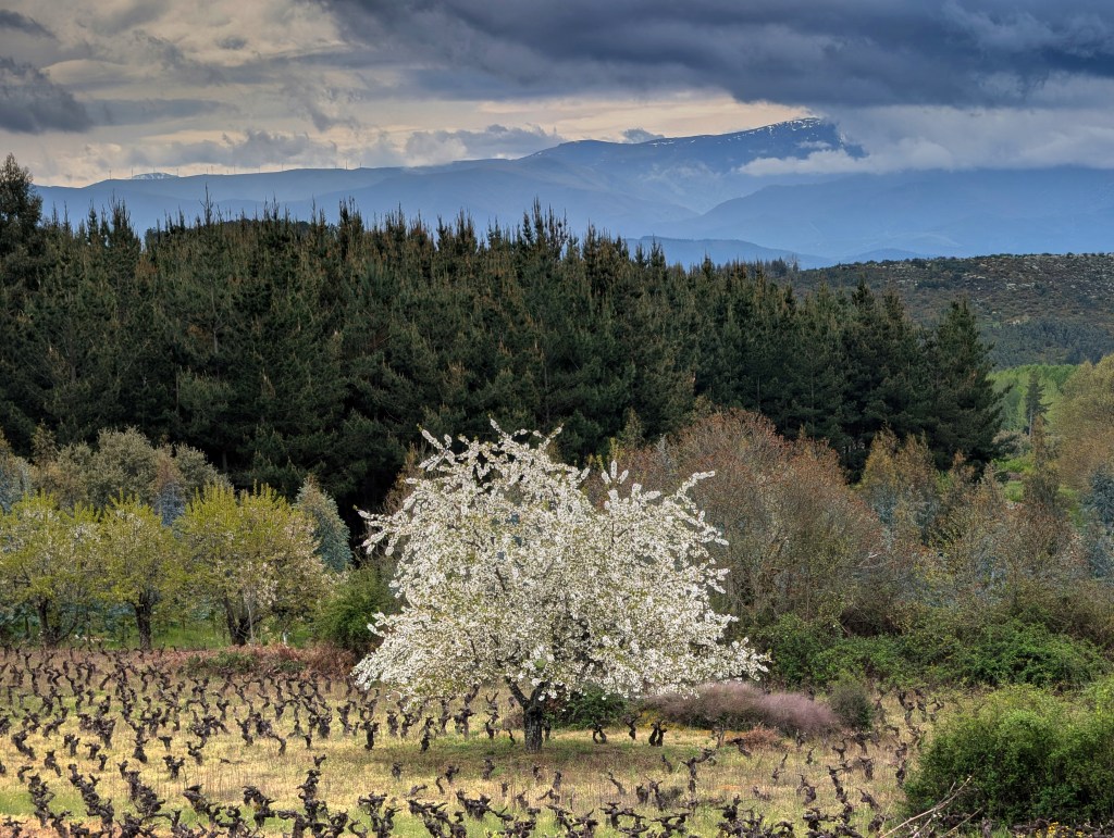 Un cerezo en flor anuncia la plena primavera en las cercanías de Campelo, municipio de Arganza, El Bierzo.