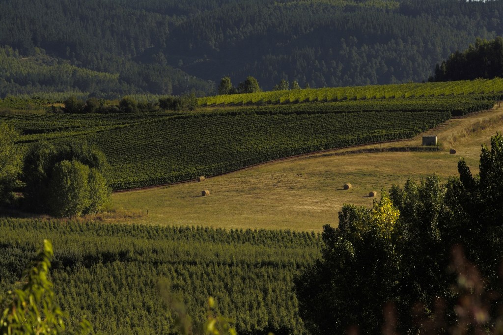 Campo de cereales, ya cosechado, con sus fardos de paja en medio de viñedos emparrados en las cercanías de Magaz de Arriba, Arganza, El Bierzo.