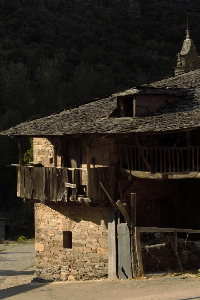 Casa de Espanillo, Arganza, El Bierzo, con el campanario de la Iglesia de Santa María detrás.