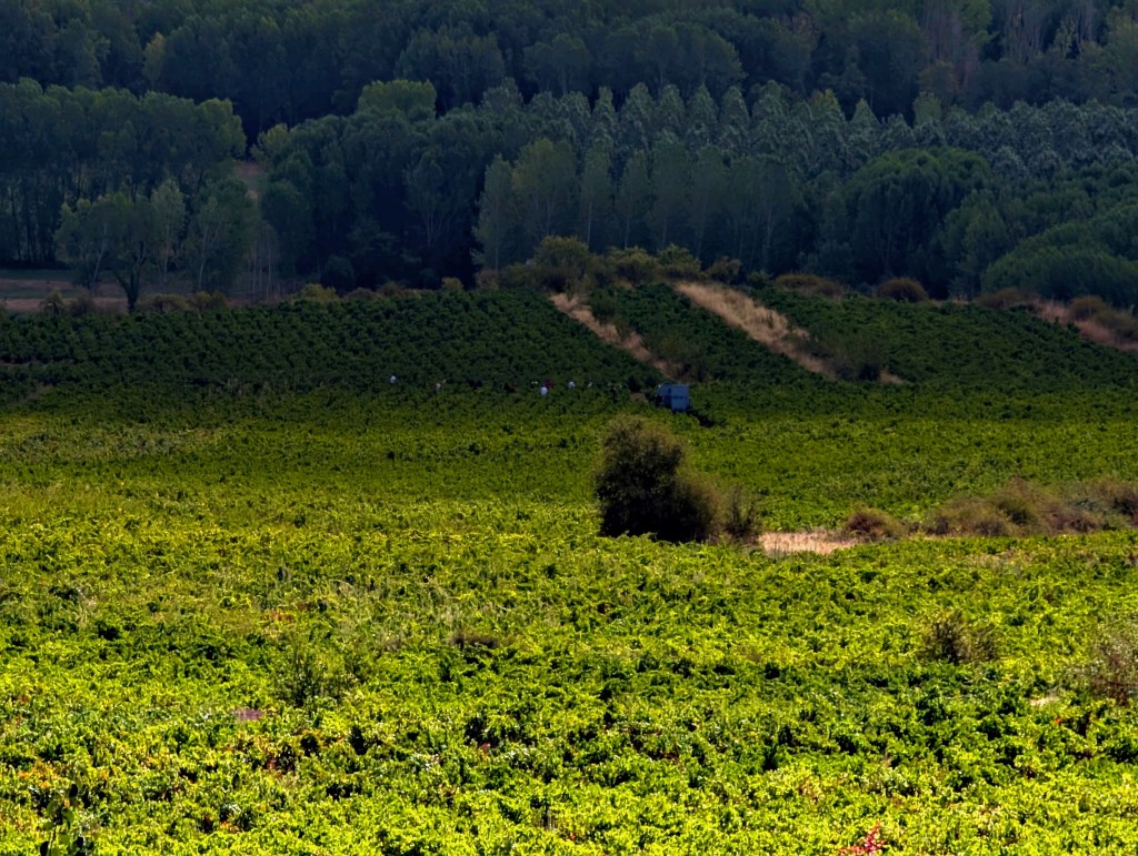 Esforzados vendimiadores inician una temprana recogida de la uva en Cacabelos, El Bierzo.