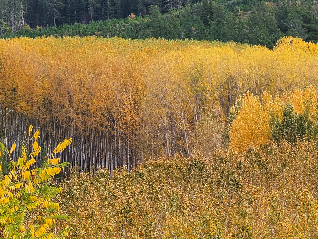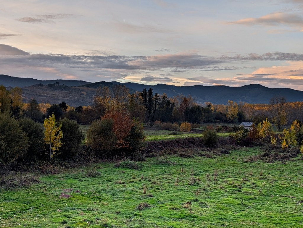 Contraste entre el verde de los árboles de hoja perenne y los tonos de los de hoja caduca en las cercanías de Arganza, El Bierzo.