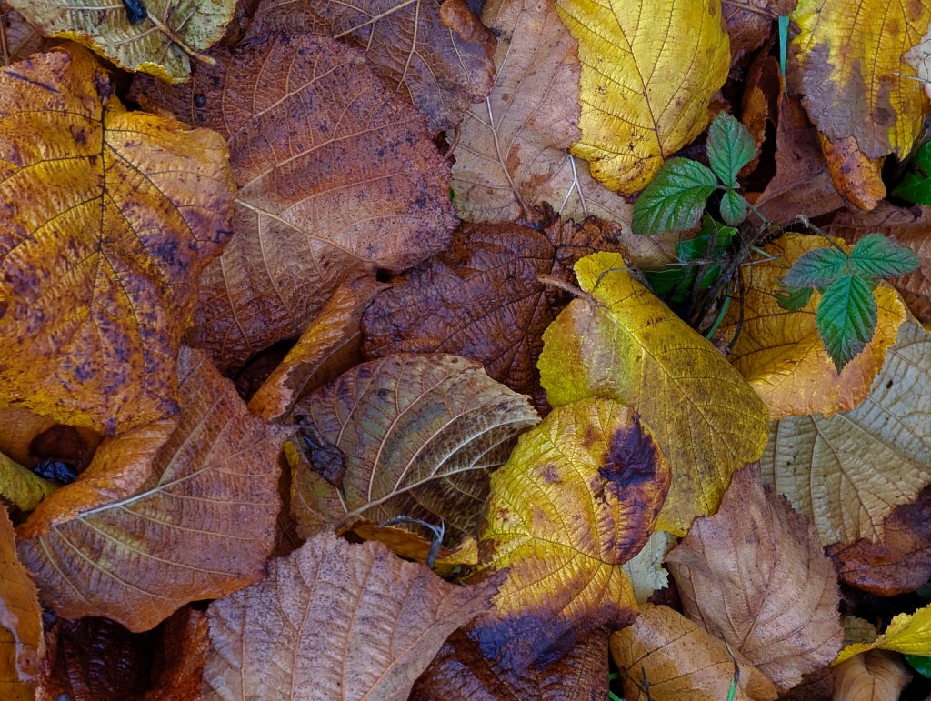 Hojas de avellano sobre la superficie del suelo mostrando sus variopintos colores en uno de los infinitos rincones de El Bierzo.