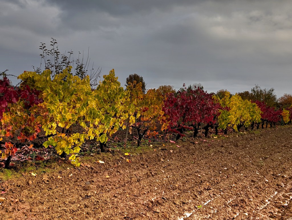 Hilera de vides con los colores del otoño en una de las huertas del paraje de La Edrada, Cacabelos, El Bierzo.