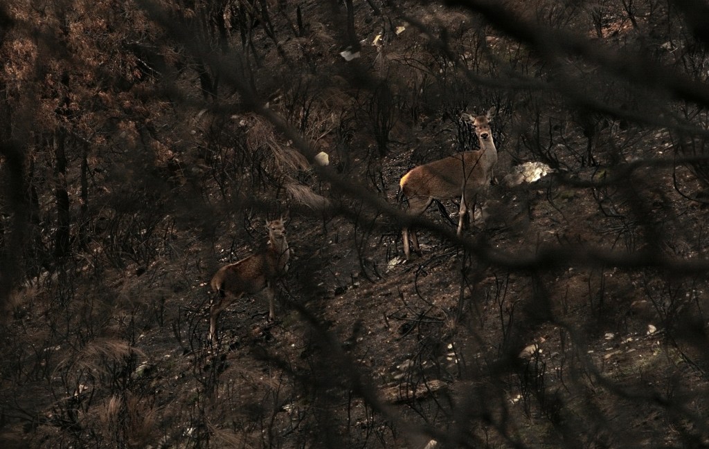 Una familia de corzos en Manzanedo de Valdueza cruzando su mirada con la del fotógrafo que los estaba inmortalizando, trotando por una de las laderas arrasada por el fuego de 2017, con el robledal rebrotando con fuerza en la actualidad (2025).