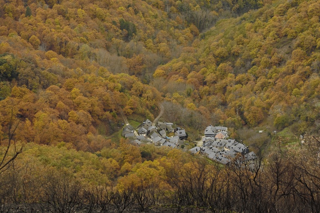 Una de las laderas cercanas a la localidad de Peñalba de Santiago (abajo a la derecha) reducida a cenizas por uno de los incendios de 2025.