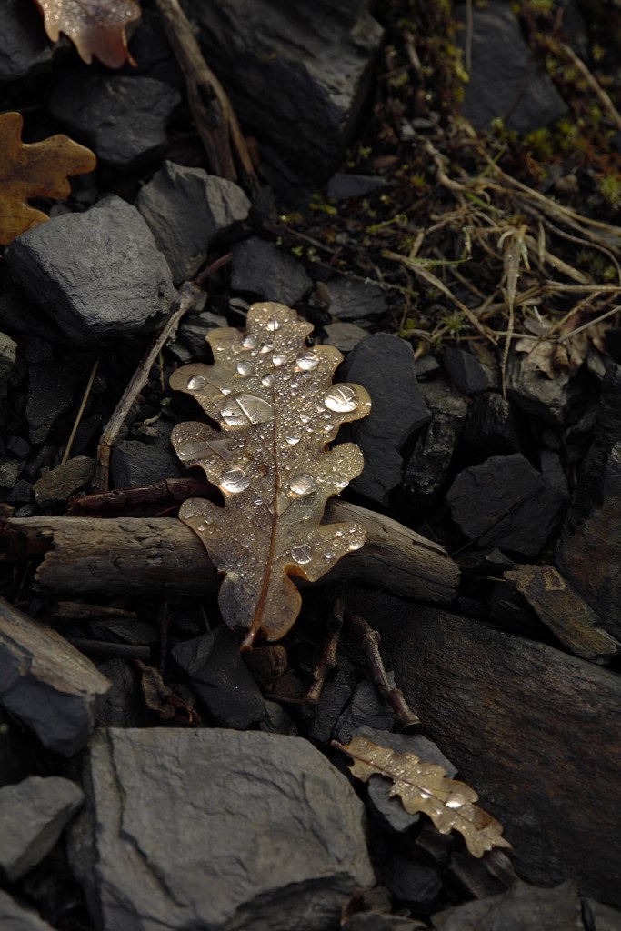 Entre rocas y hojarasca las hojas de roble cercanas al río Primout con las gotas de la lluvia caída durante la madrugada de una fría mañana del mes de diciembre.