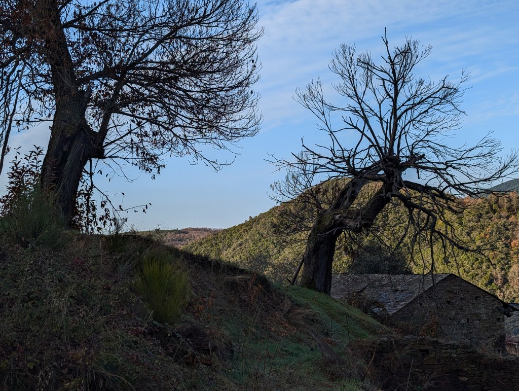 Castaños y casa tradicional en Librán, Toreno, El Bierzo.