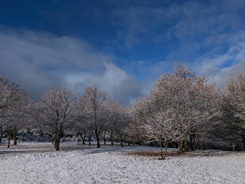 Joven castañar nevado cercano a Pobladura del Somoza, Villafranca del Bierzo.