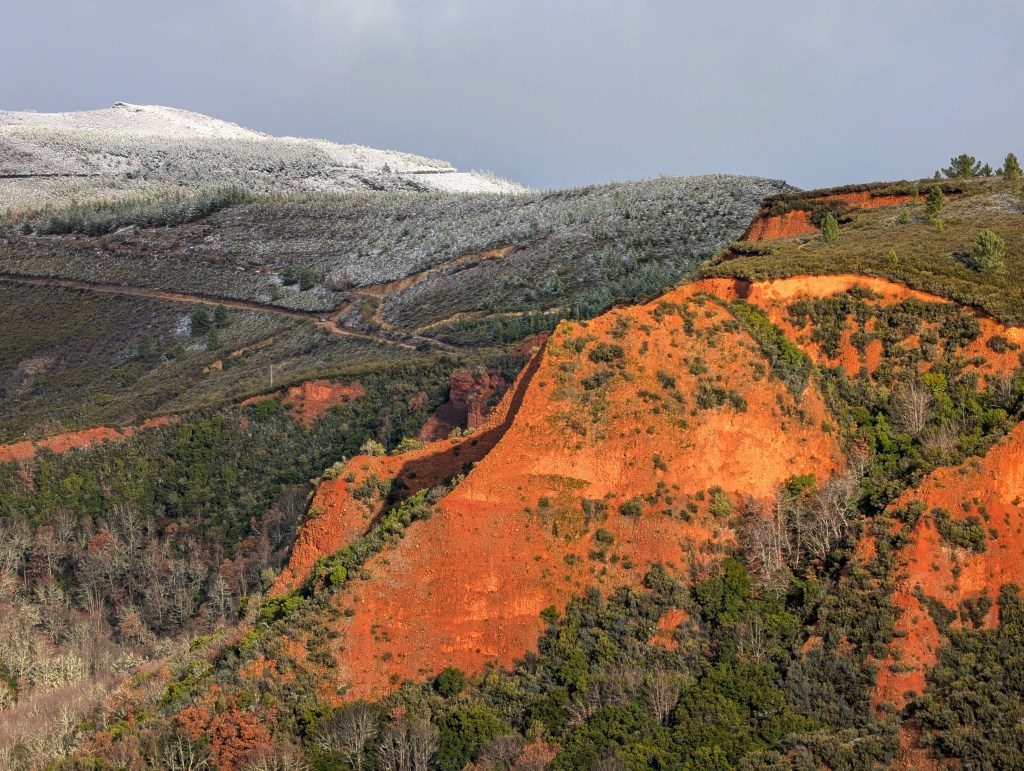 Montañas de tierra roja en el exótico paraje de La Leitosa, Villafranca del Bierzo, con los espectaculares y enormes taludes originados de la explotación aurífera en tiempos del imperio romano.