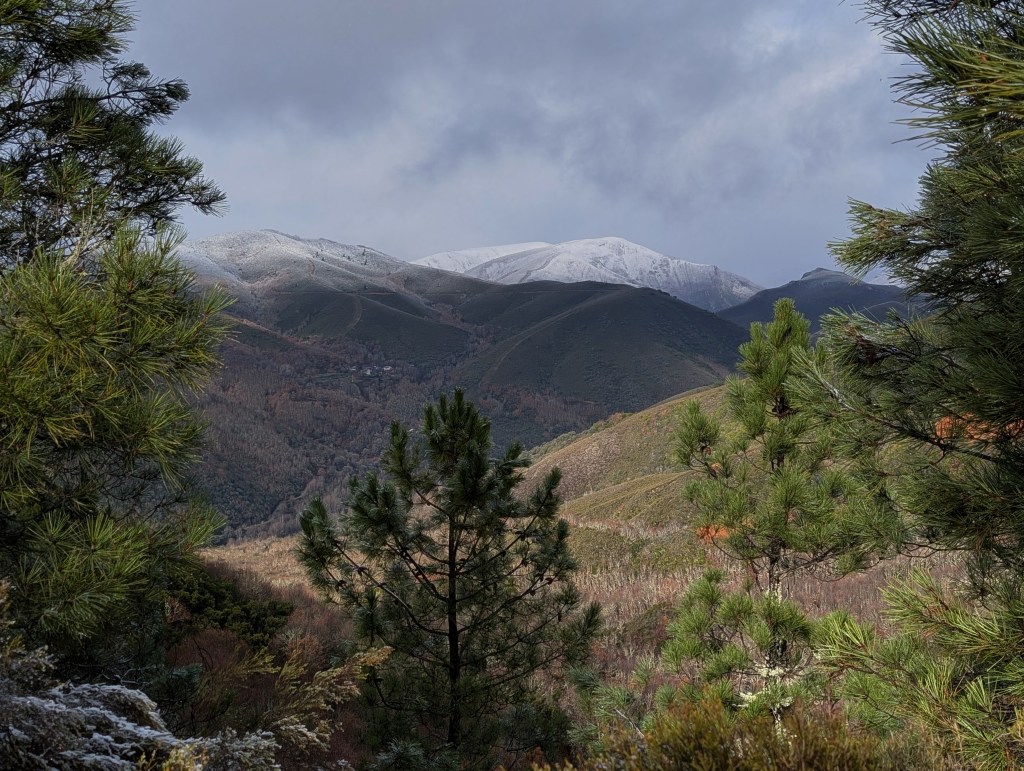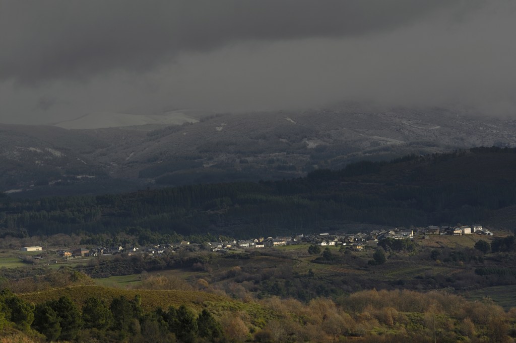 La Sierra de Ancares con sus montañas cubiertas con las primeras nieves del invierno y con el poblado de Paradaseca,Villafranca del Bierzo semioculto entre castaños, robles y brezos.