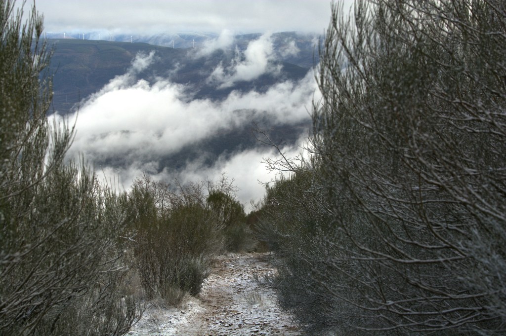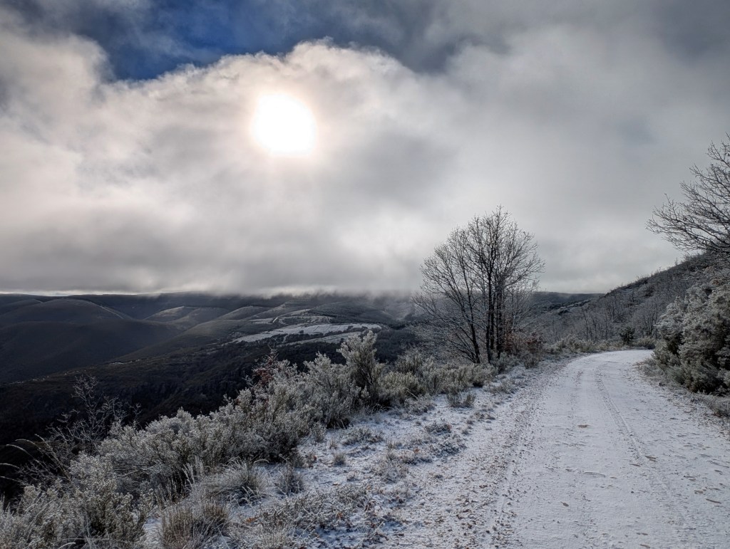 Camino helado con la aldea de Matavenero,Torre del Bierzo, a la izquierda.