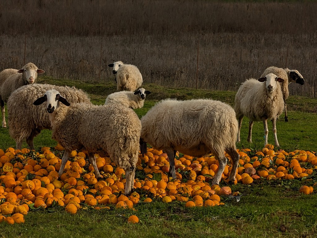 Ovejas paralizadas por la presencia del fotógrafo interrumpiendo un buen banquete de naranjas en las inmediaciones de Camponaraya, El Bierzo.