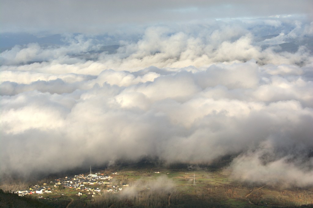 La localidad de Turienzo Castañero, municipio de Castropodame, a punto de ser cubierta por la densa niebla.