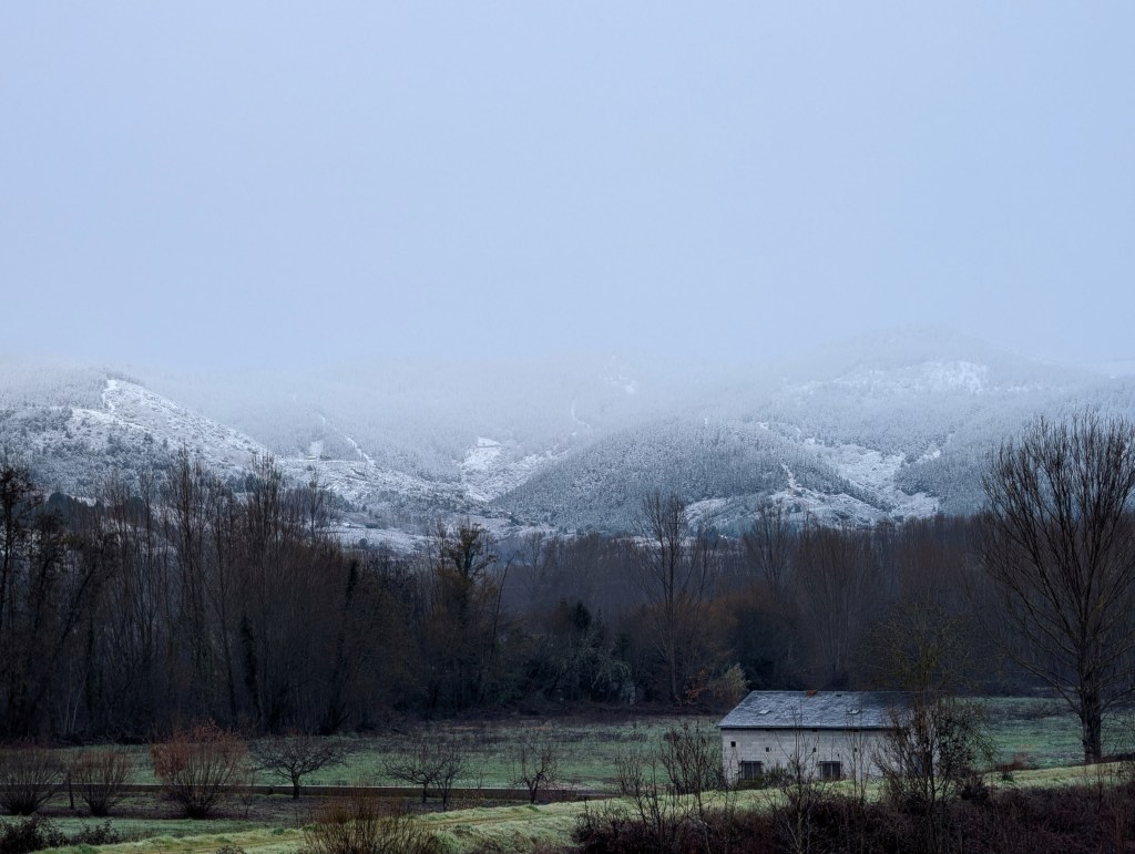 Montes nevados cercanos a Pobladura de Somoza (Villafranca del Bierzo), en una toma desde el puente sobre el río Cúa, Cacabelos, El Bierzo.