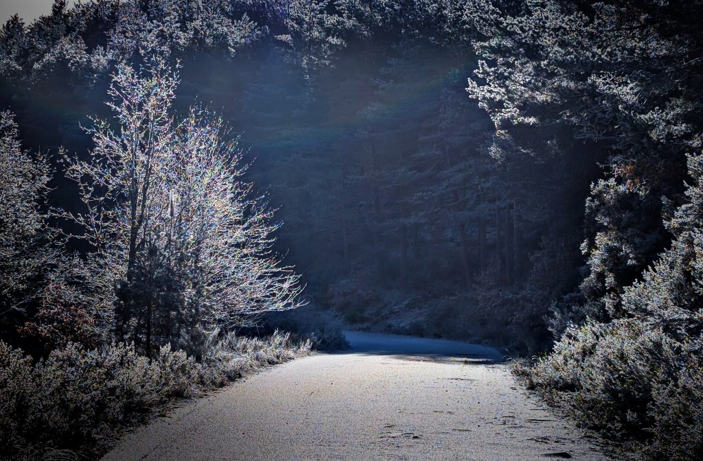 Pista de tierra con su superficie helada en las cercanías de Turienzo Castañero, Castropodame, El Bierzo.