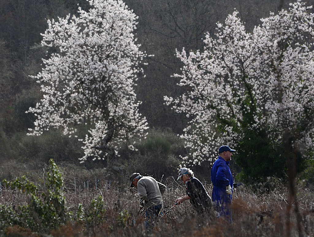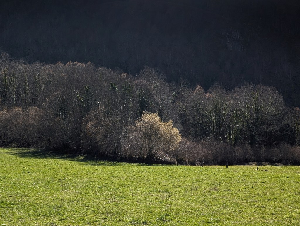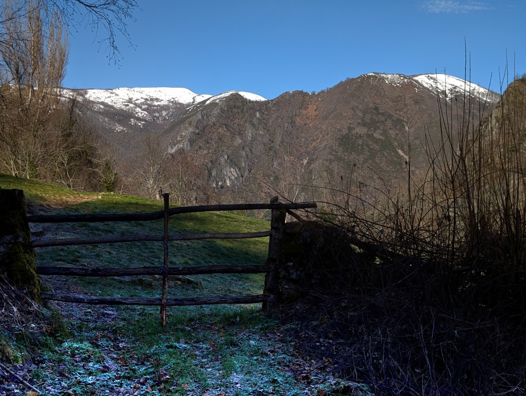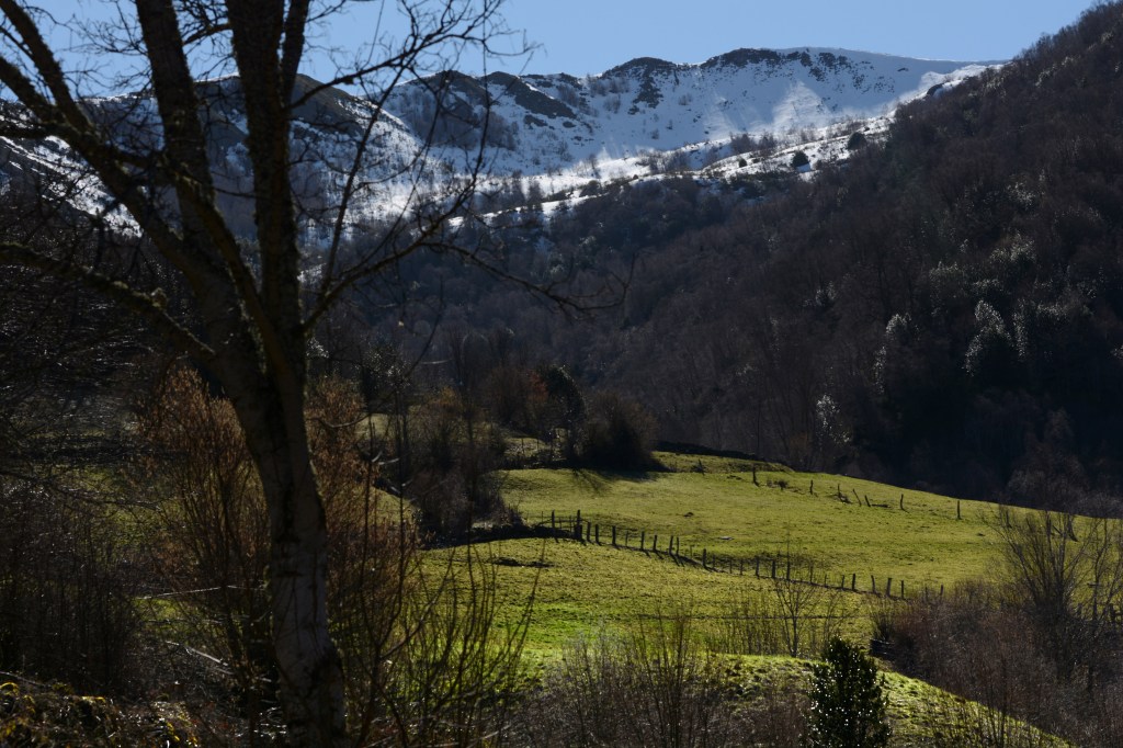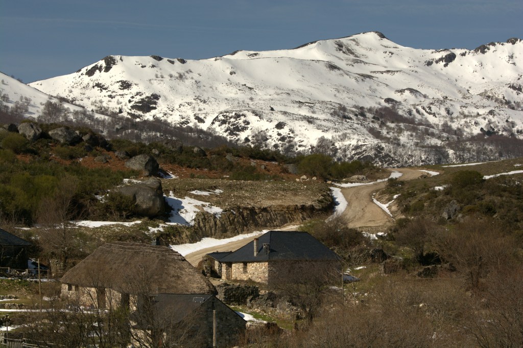 Campo del Agua, Villafranca del Bierzo, con las montañas al final del invierno.